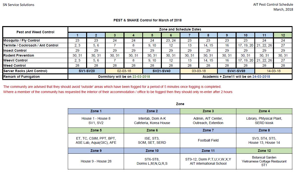 Pest control Schedule March 2018