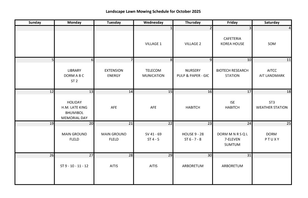 LANDSCAPE AND GROUND MAINTENANCE SCHEDULE FOR OCTOBER 2025