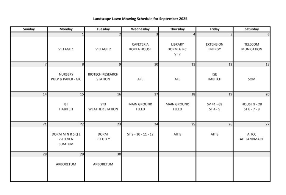 LANDSCAPE AND GROUND MAINTENANCE SCHEDULE FOR SEPTEMBER 2025