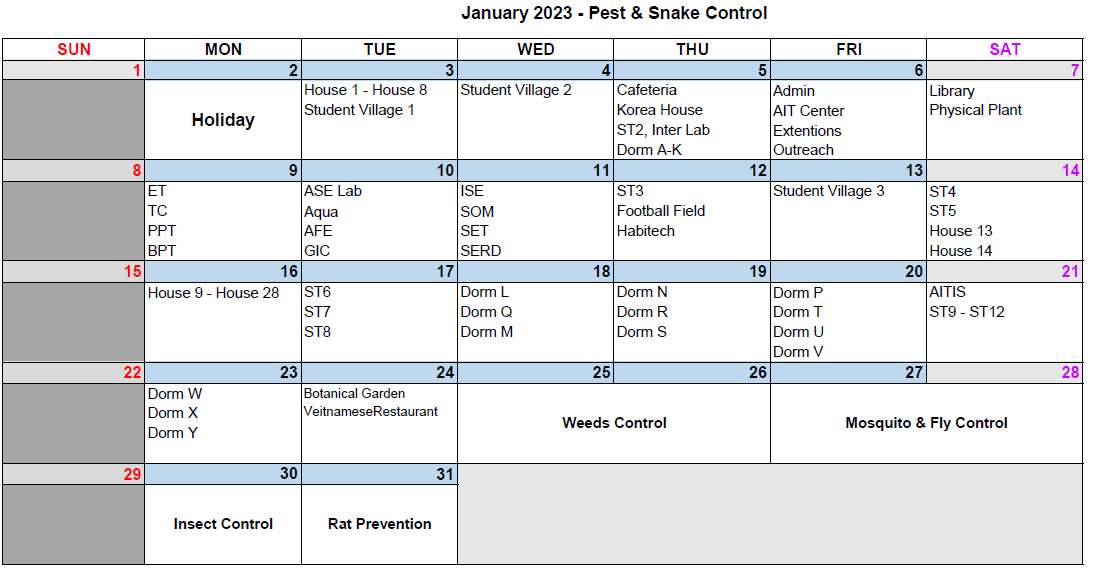 Pest Control Schedule January 2023